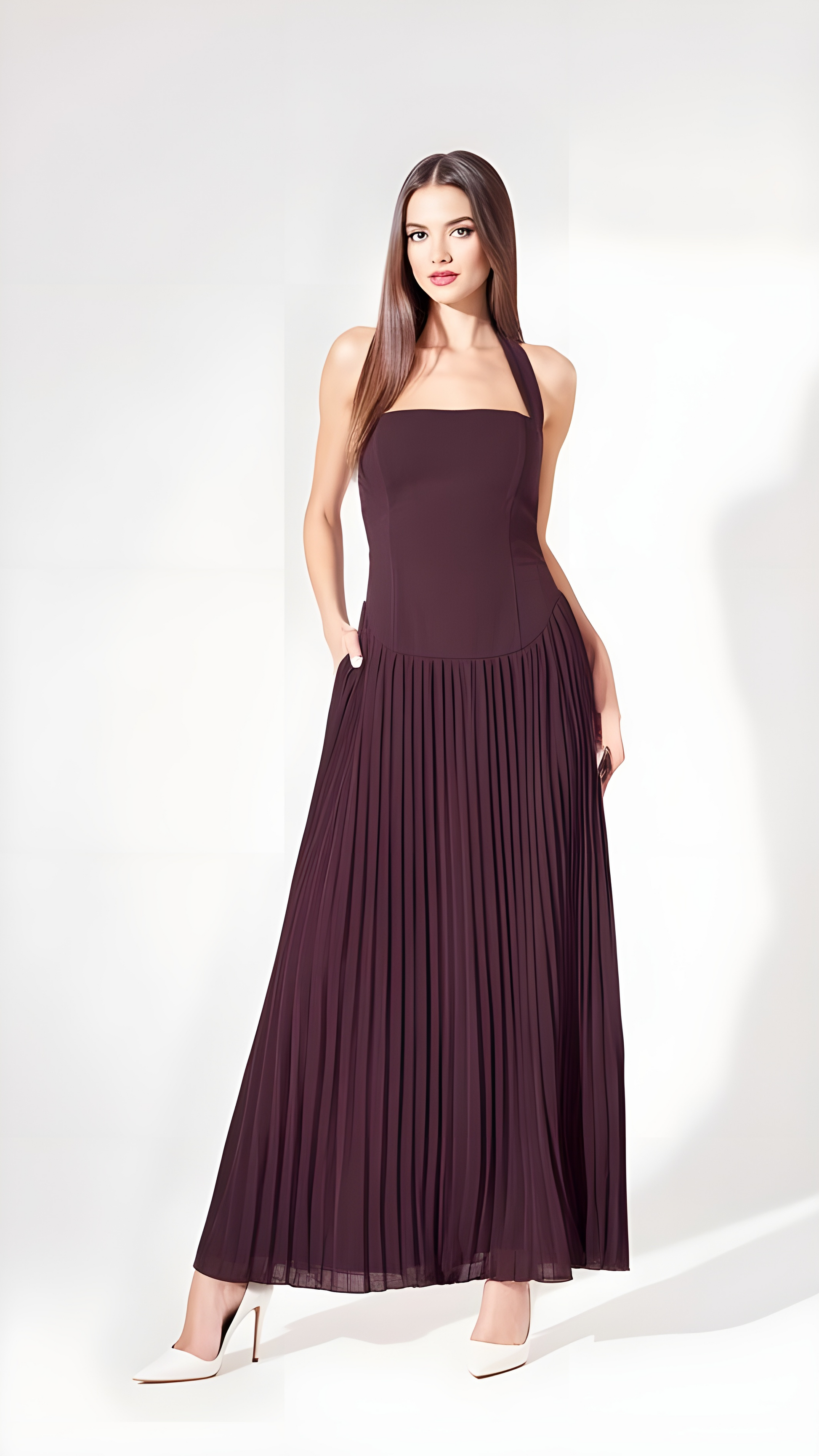 Pleated Halter Maxi Dress, a stunning fusion of structure and fluidity. Designed with a strapless, fitted bodice and internal boning, this dress offers a sculpted silhouette that accentuates your figure. The drop waist transitions seamlessly into a flowing pleated contrast skirt, creating movement with every step. Finished with a discreet side zip for a sleek fit, the dress is the perfect choice for weddings, and special occasions.